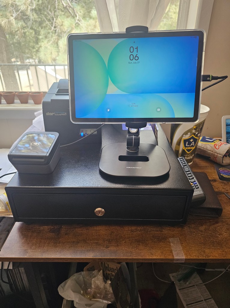 Need a mobile point of Sale system. We can help with that. This model uses an ATT 4G/5G data enabled Tablet, Bluetooth tap/ insert debit and credit card reader with a rechargable battery docking station. A bluetooth receipt printer with RJ12 cable to power and control the cash register.